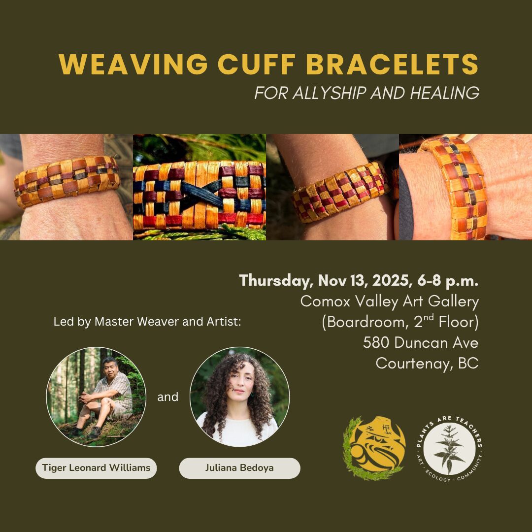 Weaving Cuff Bracelets for Allyship and Healing. Join Master Weaver Tiger Leonard Williams (Quatsino First Nation) and environmental artist Juliana Bedoya for a hands-on cuff bracelet weaving workshop.